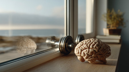 A striking conceptual image showcasing a brain model next to dumbbells by a window, symbolizing mental strength and physical fitness in a serene environment.
