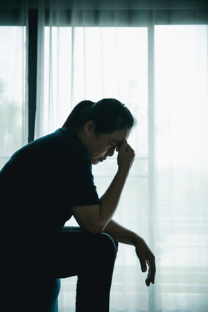 Sad depressed anxiety Asian man thinking contemplating bad thing happened in his life, stress exhausted feeling down expression, financial or relationship problem concept