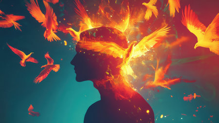 A man's silhouette stands against a bold orange background. A phoenix bursts forth from the man's head, symbolizing transformation and rebirth, as the sun sets, creating a dynamic contrast.