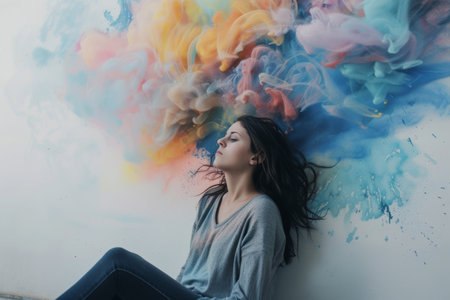 A woman stands thoughtfully with her eyes closed surrounded by vibrant colors and abstract patterns creating a peaceful atmosphere.