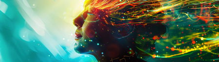 This striking digital artwork features a human face in profile, blended with vibrant graphics and abstract elements that evoke creativity and imagination.