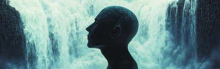 A mystical portrayal captures the profile of a man, his silhouette filled with a powerful cascading waterfall. The serene landscape evokes a sense of tranquility and wonder.