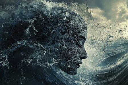 An intricate design merges a human face with turbulent ocean waves under a cloudy sky, showcasing creativity.