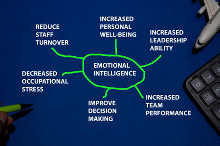 Emotional Intelligence text with keywords isolated on blue background. Chart or mechanism concept.