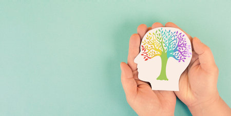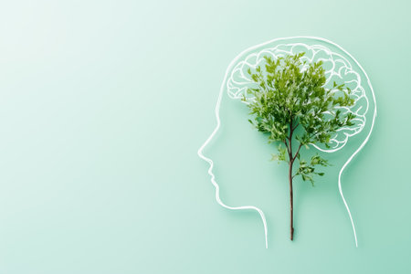 A tree is emerging from the outline of a human head symbolizing the connection between nature and mental wellness. The soft green background enhances a calming atmosphere.