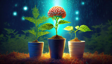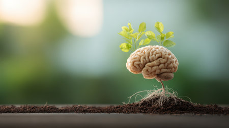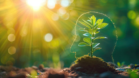 A captivating image showing a plant sprouting from a brain, symbolizing the interconnection between nature and human intellect. The sun's rays highlight growth and creativity.