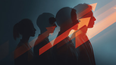 Image features silhouette of four individuals profile, layered with dynamic orange arrows suggesting growth and progress. contrasting colors create sense of movement and aspiration, evoking