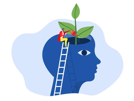 Growth mindset concept ,people reading book with watering plants from the brain as personality growth, self-improvement and self-improvement ideas flat vector illustrator