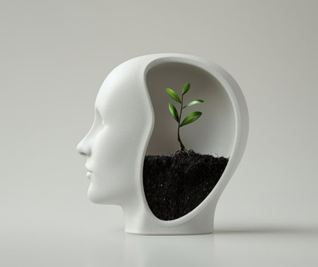 A silhouette of a person's head filled with dark soil and a vibrant green plant, indicating a strong connection with nature.