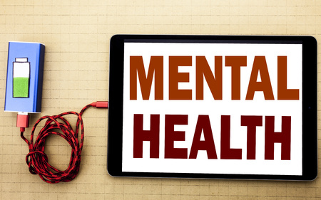 Hand writing text caption inspiration showing Mental Health. Business concept for Anxiety Illness Disorder written on tablet laptop with white textured background with mobile charger power bank