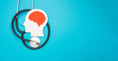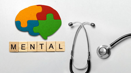 A stethoscope and a colorful brain puzzle with health text are on a colored background. Mental health concept