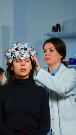 Woman patient wearing eeg scanner during neuroscience experiment in clinical neurology laboratory. Medical teeam of neurologist monitoring brain evolution analyzing nervous system activity