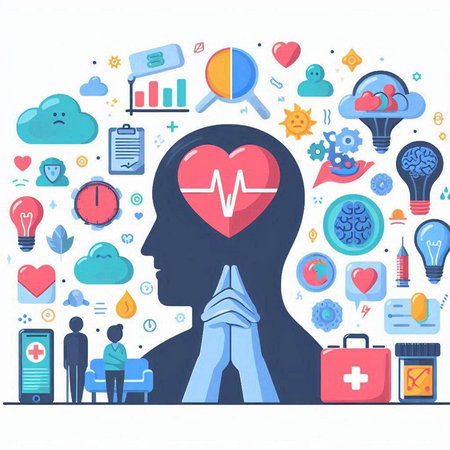 Vector illustration of mental health concept in flat design style. Human head with heart beat, medical icons.