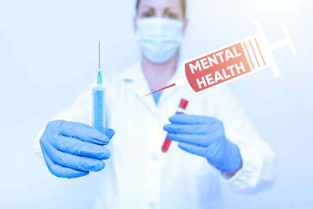 Hand writing sign Mental Health. Word Written on persons condition regard to their psychological well being Testing New Vaccine For The Virus Presenting Vaccination Clinical Trials