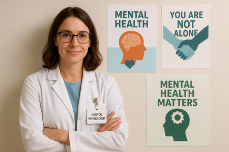 Confident psychologist standing with crossed arms in front of posters promoting mental health awareness and support