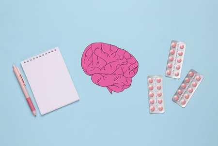 Paper-cut brain with pills and notebook on blue background. Headache treatment