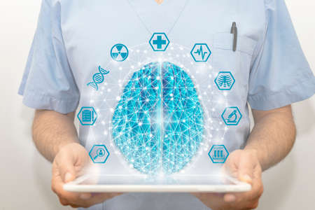 Artificial intelligence in medicine. Doctor with the tablet on which the digital brain and medical icons are presented.