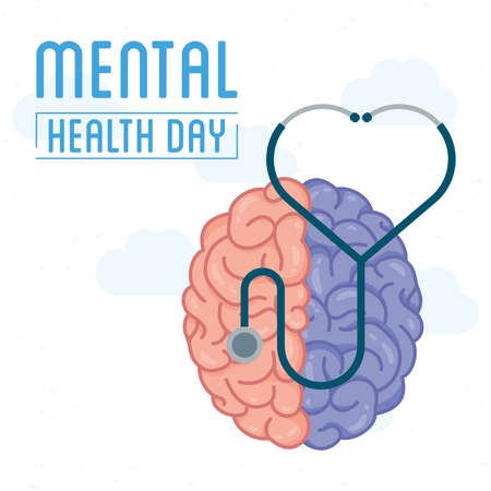 Mental Health Day lettering with brain and stethoscope vector illustration design