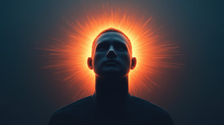 A young man meditates with closed eyes, vibrant light rays emanating from his forehead against a deep blue background. Symbolizes enlightenment, creativity, or spiritual awakening.