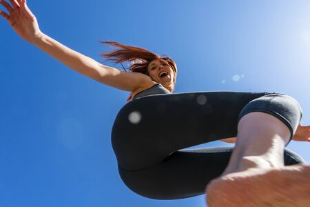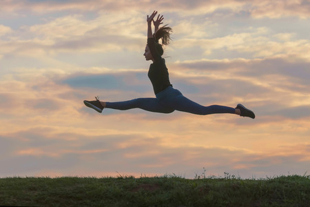Sporty young woman jumping outdoor morning clouds background, Athlete Woman jump beautiful sunrise morning workout