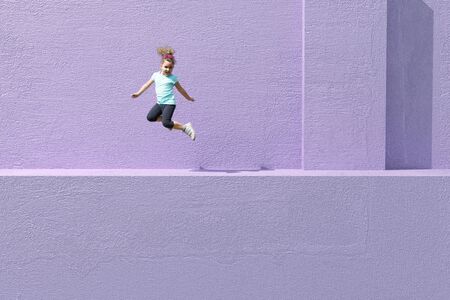 happy child jumping on the background of the sky. freedom to feel good and summer vacation concept.