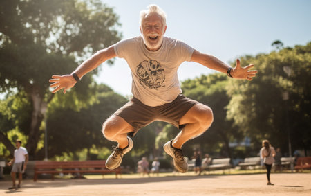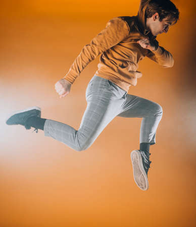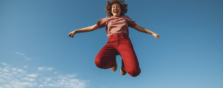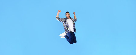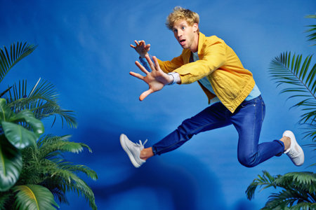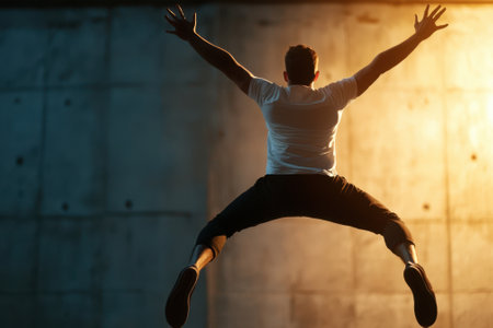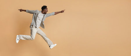 Free jumping Midair shot of handsome young man jumping and gesturing against background : Generative AI