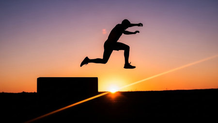 A dynamic silhouette of a person mid-jump over a dark obstacle against a vibrant sunset sky, symbolizing achievement and effort.