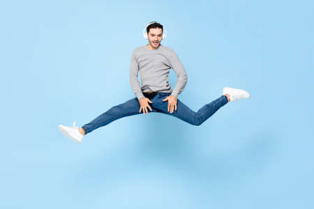 Fun energetic young Caucasian man wearing headphones listening to music and jumping with spread legs in studio light blue color isolated background