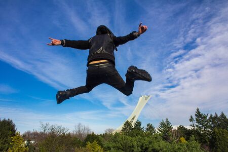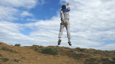 Jumping man in the sky. Man jumping in the sunshine against blue sky. Concept: freedom, success, energy, vitality.