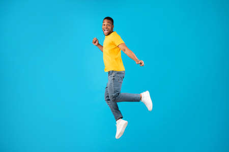 Crazy Sales. Excited black guy jumping up in air and pointing aside