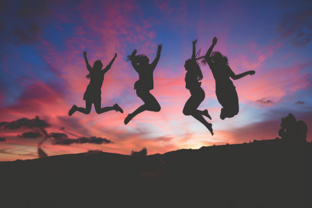A group of friends jumping in unison, their silhouettes captured against a colorful sky