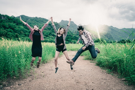 Group of happy young people jumping in the air while traveling in mountain and nature trail. Travel and outdoors lifestyle concept.