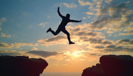 Silhouette of a man leaping between cliffs against a sunset sky symbolizing strength and courage