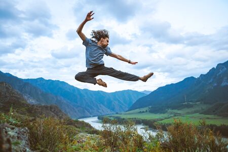 guy jumps on top of a mountain on the background of mountains in karate pose