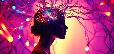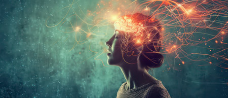 A woman with a glowing brain stands against a cosmic backdrop. The brain is surrounded by vibrant, swirling energy and the woman appears lost in thought.