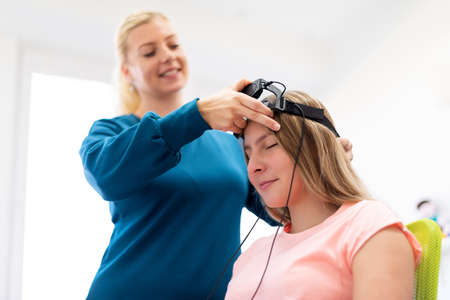 Young teenage girl and child therapist during EEG neurofeedback session. Electroencephalography concept.