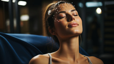 A young woman is seen undergoing an EEG procedure in a modern clinic, showcasing advanced technology to monitor brain activity and health.