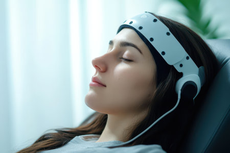 A young woman is peacefully reclining with headgear used for brain stimulation while listening to calming sounds in a serene environment.