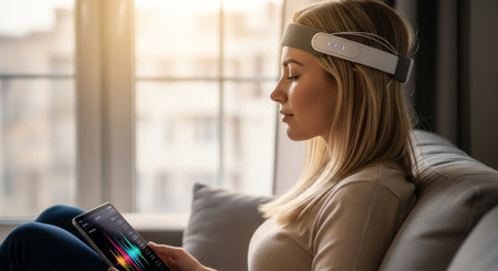 Young Caucasian woman with long blond hair uses a tablet while wearing a headband device. She sits on a sofa near a window with soft sunlight.