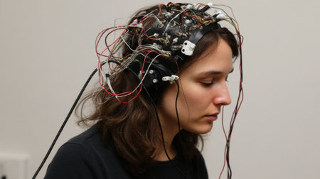 A woman wearing an electrode cap designed for brain activity monitoring in a neuroscience research lab, exemplifying cutting-edge technology and innovation.