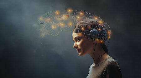 A close observation of a neural interface headset perched on a users head wires connecting to visible neurosensors that monitor brain activity in realtime..