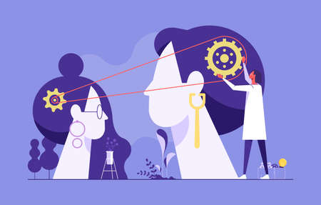 Collaboration and synergy, two people share ideas or connected mind mechanisms,