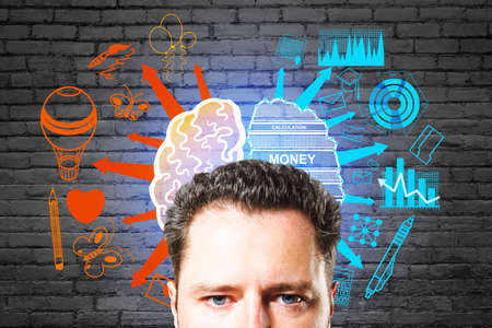 Portrait of attractive young european businessman with creative brain sketch with creative and analytical side on brick background. Science, mind and creativity concept