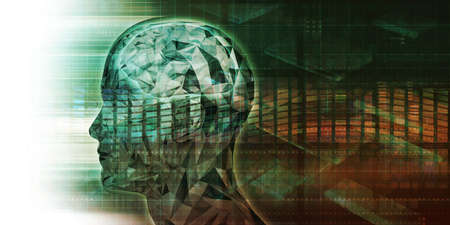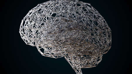 Computer generated artificial intelligence. 3d rendering of the shape of the human brain from a wireframe against the background of colored lights