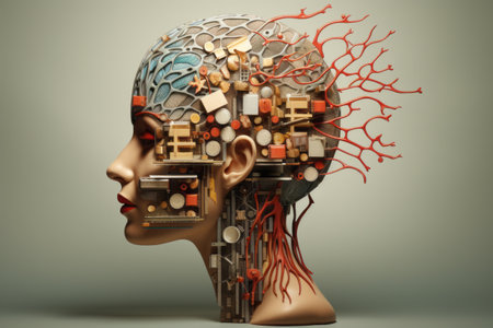 A profile view of a human head silhouette is intricately filled with a vibrant mosaic of colorful gears and cogs working together.