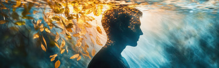 A serene setting captures a man submerged in water, glowing with radiant light as golden leaves drift around him, creating a tranquil, dreamlike atmosphere at twilight.