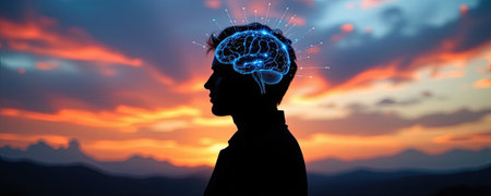 An artistic silhouette of a person with a glowing brain illustration, set against a breathtaking sunset backdrop over mountains, symbolizing creativity and inspiration.