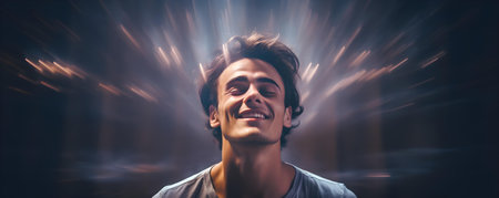 Young man in emotional moment feeling divine presence and connection to faith. Concept Faith, Spiritual Connection, Divine Presence, Emotional Moment, Young Man