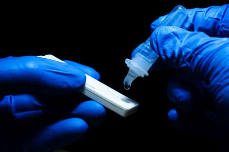 Hand in protective glove making antigen covid test with pipette and saliva