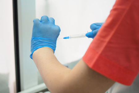 Close up of a doctor wearing blue gloves holding a syringe with his hands, taking a sample of red liquid from a round plastic container with a group of round red clinical sample in the background